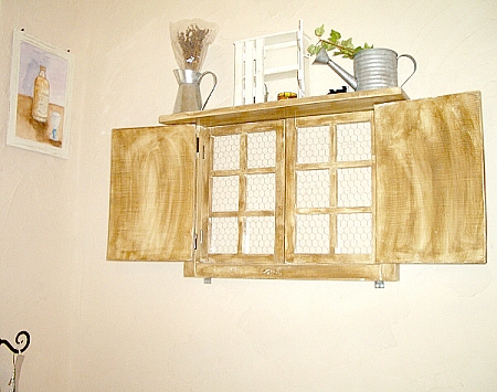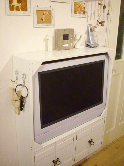 下はCDやDVDの保管場所です。 キャビネットの上の真ん中の箱は ドアフォンモニターです 裸のままだと雰囲気を壊すので 薄いベニヤに塗装して貼り付けて 作りました。 ーが 今は テレビを46型に買い換えたので このテレビはキャビネットごと寝室で使っています。 |