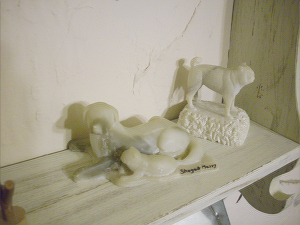 棚にのっている2体の犬の置物は 我が家の愛犬のパグとゴールデン。 昔 ろう石をガリガリ削って 作りました。 悲しい事にゴールデンの方が H19年5月に パグがH21年5月に死んでしまいました(;_;) |